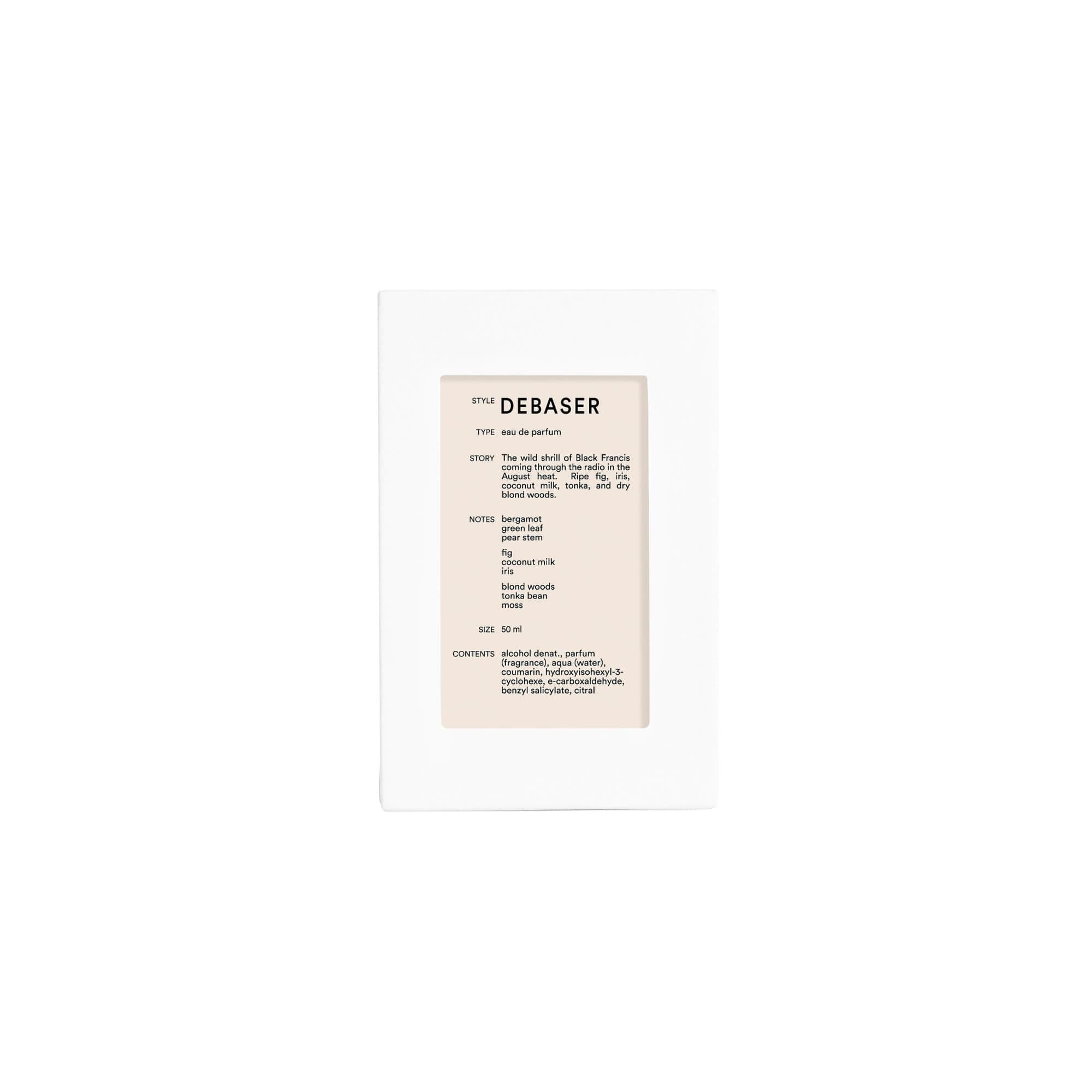 Debaser captura el salvajismo sensual de una canción sonando a todo volumen en plena ola de calor. Inspirado en la voz provocadora de Black Francis y en la efervescencia rebelde de finales de los 80, este perfume es una mezcla ardiente de hojas verdes, higo maduro, leche de coco e iris que se funde con el dulzor especiado del haba tonka y la calidez seca de maderas rubias.