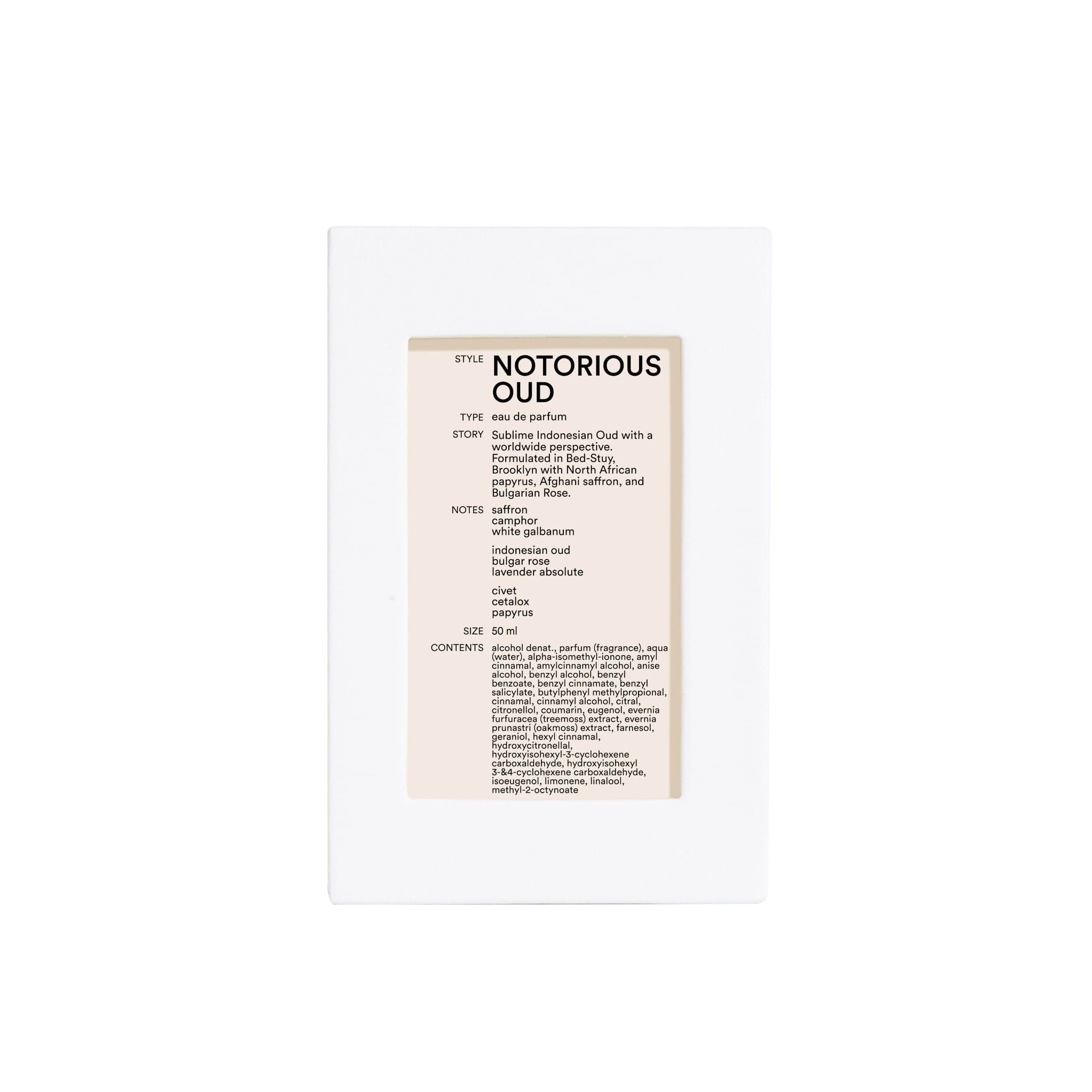 Notorious Oud es una sinfonía olfativa construida alrededor de uno de los ingredientes más legendarios y codiciados de la perfumería: el oud indonesio. Desde su estudio en Brooklyn, el perfumista imagina una nueva vida para este acorde denso, resinoso y misterioso, enriqueciéndolo con materiales nobles de todo el mundo. La rosa búlgara aporta un corazón floral refinado; el azafrán afgano y el papiro egipcio le dan estructura especiada y terrosa; y una lavanda francesa matiza la composición con una ligereza insospechada. Una fragancia que equilibra lo sagrado y lo cotidiano, lo animal y lo floral, lo oscuro y lo luminoso.